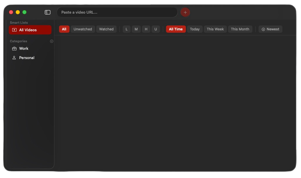 Tag videos Low, Medium, High, or Urgent. Filter by priority to surface what you want to watch next.